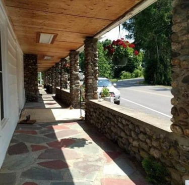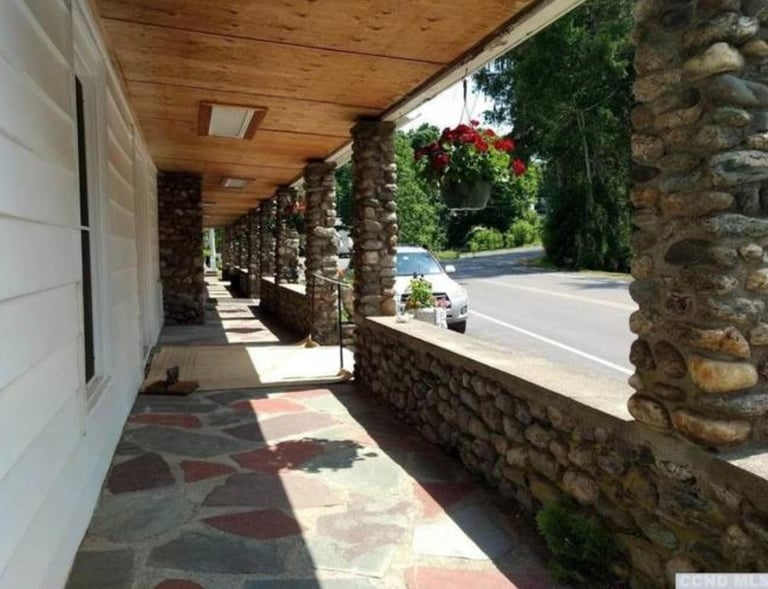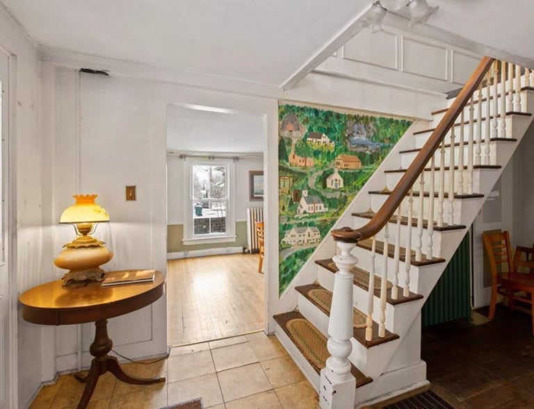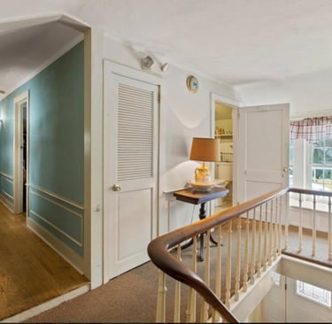 The second floor features two rental apartments with private entrances and five charming guest rooms arranged around the top of the central staircase.