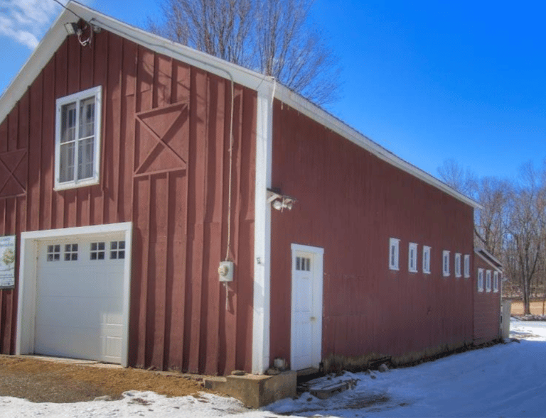 The property includes a large pole-barn (with original stable stalls) and two smaller antique barns.
